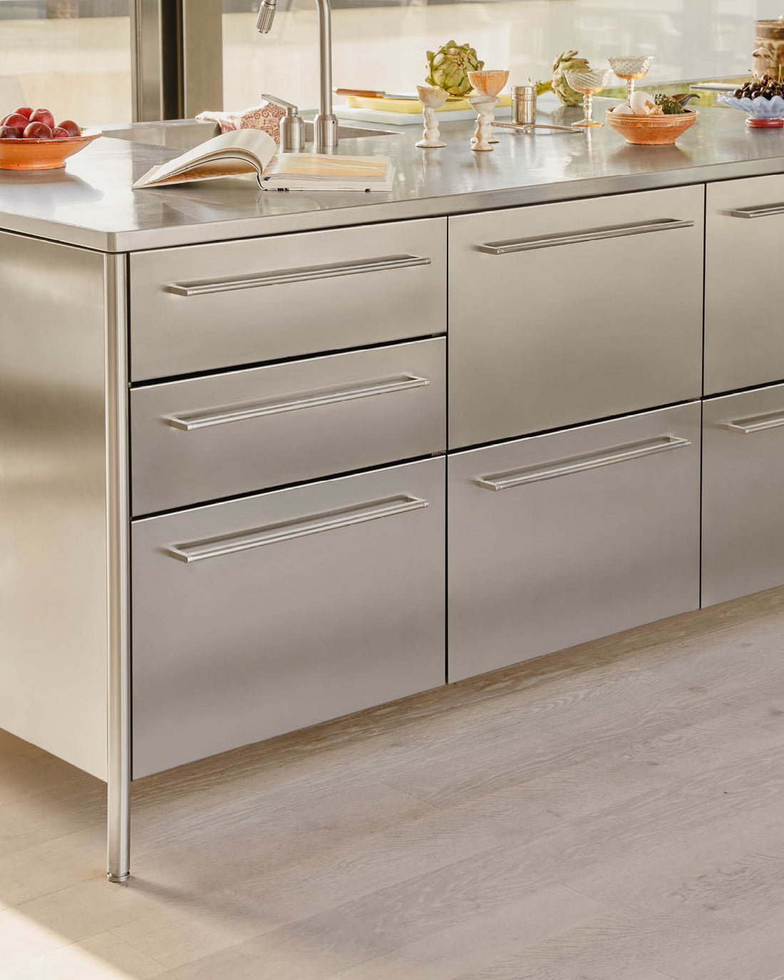 Tamamen metal yapısı ve yalın detaylarıyla V4 mutfak, profesyonel mutfakların dayanıklılığını yaşam alanlarına taşır. Paslanmaz çelik, şeflerin tercihi olmasının nedenlerini açıkça ortaya koyar: uzun ömürlülük, hijyen ve kolay bakım. Günlük kullanıma gönül rahatlığıyla dayanır; zamanla yumuşak bir patina geliştirerek mekâna karakter katar.